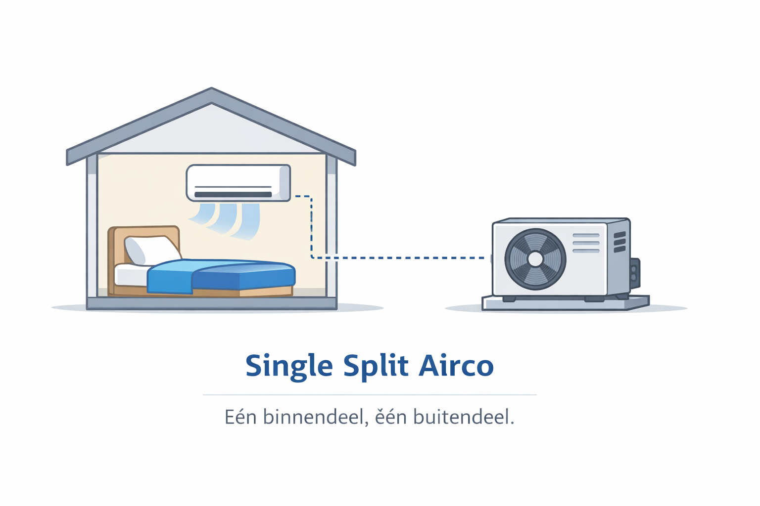 Een single split airco bestaat uit één binnendeel en één buitendeel. Dit type systeem is ideaal voor het koelen (en verwarmen) van één ruimte, zoals een slaapkamer, woonkamer of thuiskantoor.